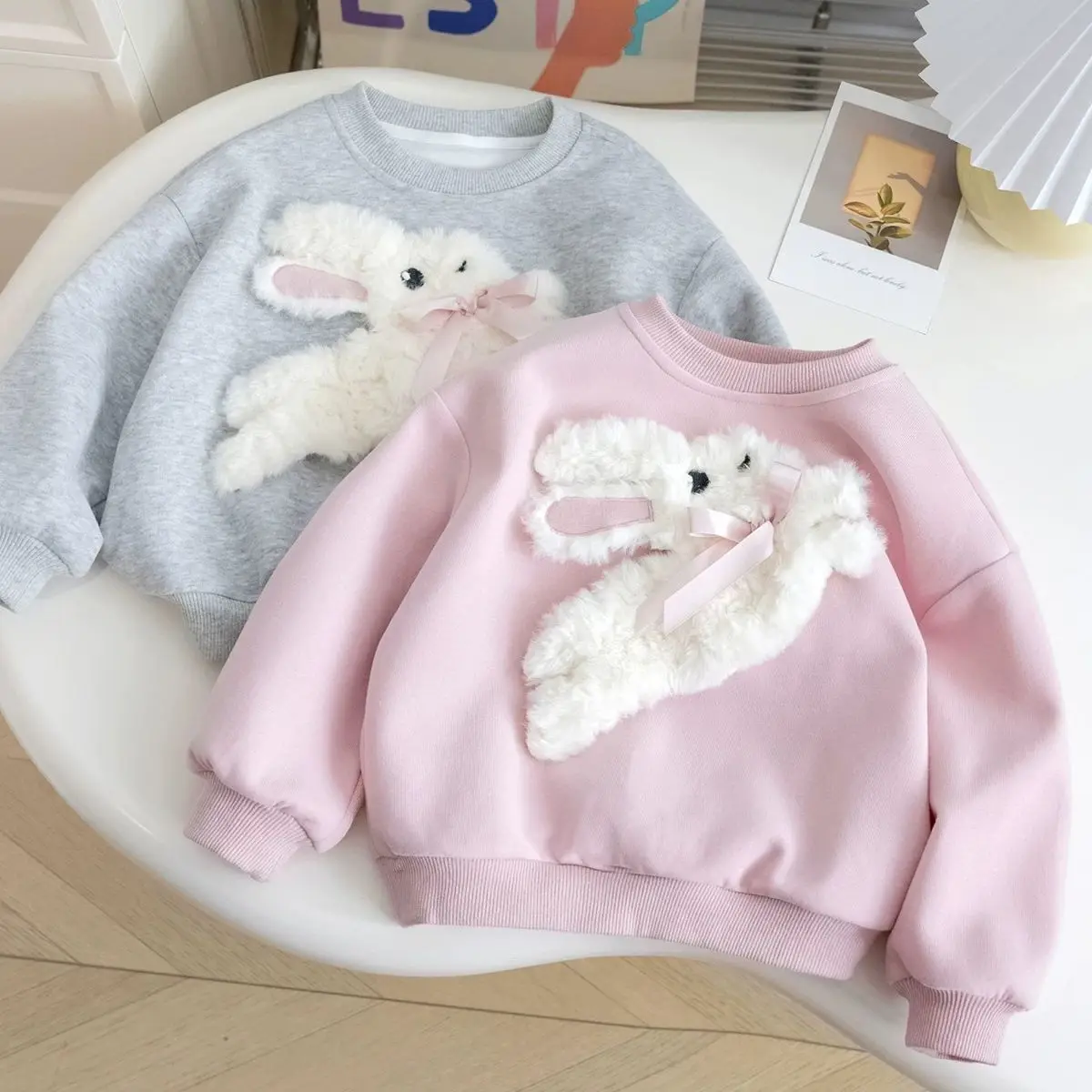 Girls Long Sleeved Sportswear 3-10 Years Old Children Cartoon 3D Plush Rabbit Hoodie Autumn Little Girl Cute Round Neck Top